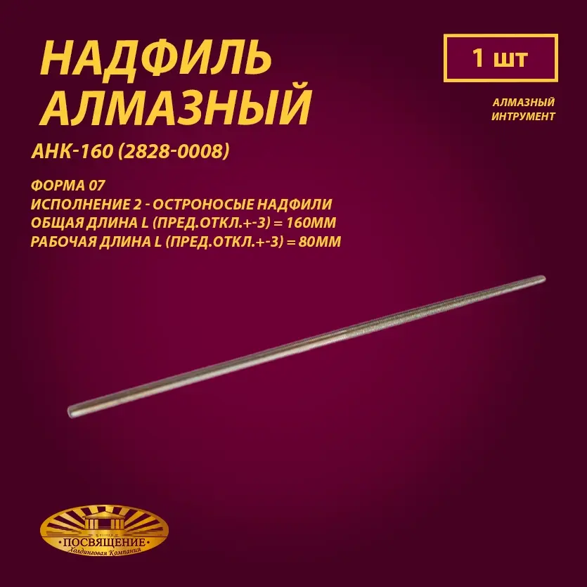 Надфиль алмазный АНК-160 (2828-0008) Форма 07 Исполнение 2 - Остроносые надфили Общая длина L (пред.откл.+-3) = 160мм Рабочая длина l (пред.откл.+-3) = 80мм